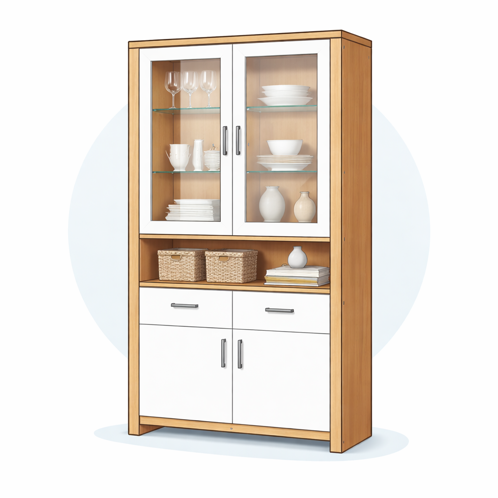 Hochschrank bzw. hoher Schrank mit Türen, Fächern oder Schubladen zur Aufbewahrung von Kleidung, Geschirr, Vorräten oder Haushaltsgegenständen. Diese Möbelstücke werden häufig im Wohnzimmer, Schlafzimmer, Badezimmer, Küche oder Flur eingesetzt und besitzen durch ihre Bauhöhe ein deutlich erhöhtes Transportvolumen.